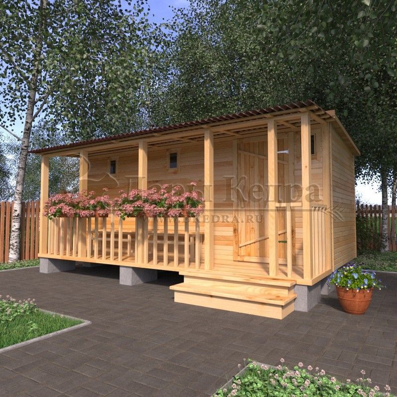 Каркасно-щитовая баня из кедра «Сканди» с верандой Это классическая прямоугольная модель бани с двумя отделениями: предбанником и парилкой, а так же удобной терассой. Предбанник оснащен лавочкой и вешалкой. Парилка оборудована двухуровневым открытым полком и печью. Время растопки такой бани не превышает 30 минут. Каркасно-щитовую баню можно заказать как в готовом, так и в разборном варианте. В разборной модели готовые щиты из кедра быстро собираются в полноценное строение, что также позволяет исключить лишний строительный мусор. Такая баня не требует полноценный фундамент, поэтому при необходимости ее можно перенести в другое место. Древесина кедра насыщена эфирными маслами и фитонцидами, которые активируются при воздействии температур. Таким образом, парение в каркаско-щитовых банях из кедра становится еще полезнее.