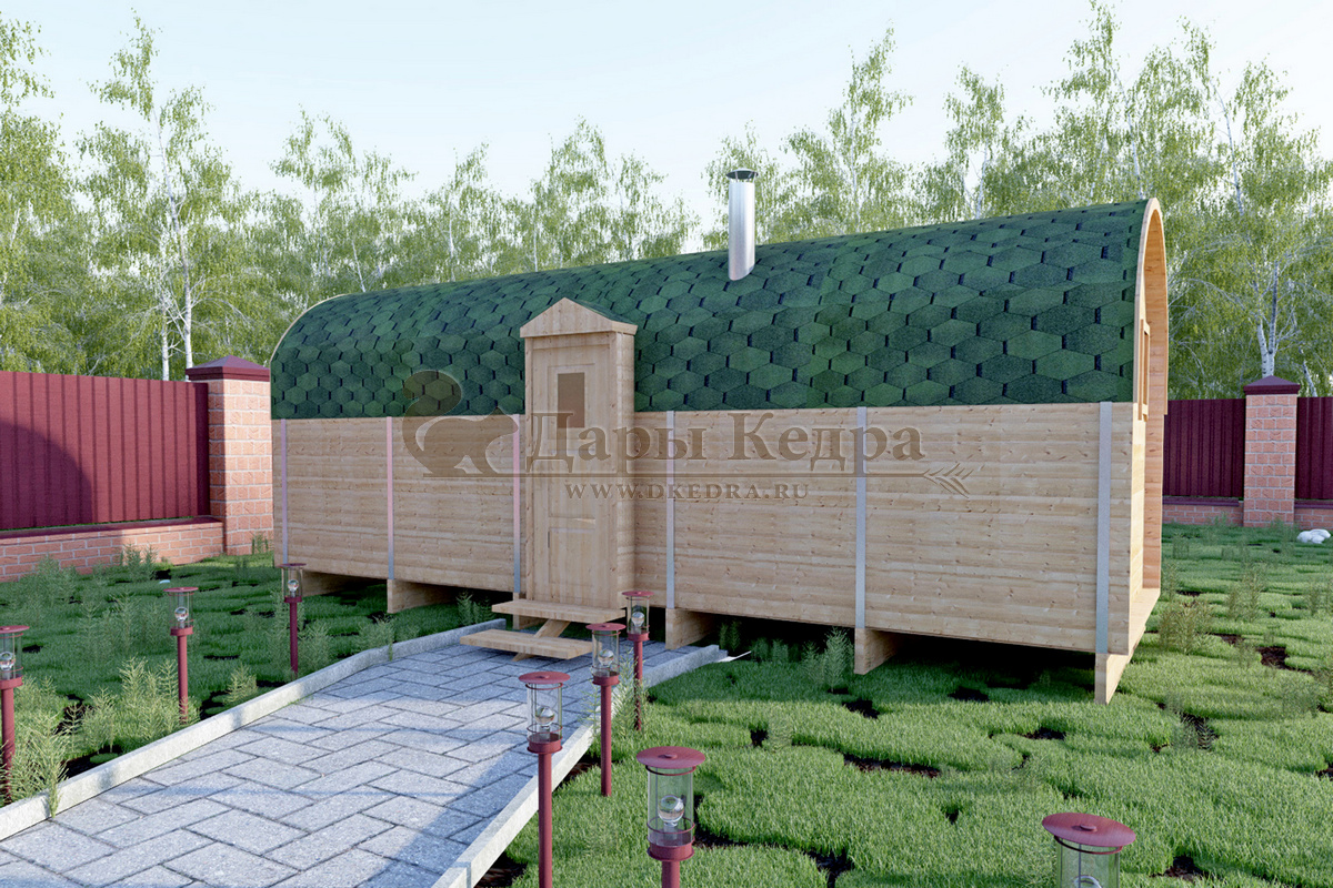 Баня-бочка буханка из кедра 6 метров с верандой Главной отличительной особенностью данной бани «Буханка» является полная обшивка гибкой черепицей всей внешней части бани, а так же наличие крытой входной группы. Включает в себя небольшую веранду, раздевалку, которая служит комнатой отдыха, моечную и парильное отделение. Для удобства пользования в раздевалке находятся лавочки и вешалка из кедра. Моечная оборудована душевым поддоном, полочкой и лавочкой. В парильном отделении по обе стороны расположены двухуровневые открытые полки, печь установлена между ними у дальней стены. Время растопки такой бани не превышает 30 минут. По вашему желанию баню-бочку можно укомплектовать козырьком, верандой и печью с внешней загрузкой, благодаря которой весь мусор после топки остается на улице. Баня-бочка буханка не требует полноценный фундамент, поэтому при необходимости ее можно перенести в другое место. Обращаем Ваше внимание, что в стандартную комплектацию бани входят полки открытого типа в парной с обеих сторон. Дополнительно можно заказать полок закрытого типа или лавку! Кедр обладает ароматическими свойствами. Он не деформируется и влагоустойчив, при правильном уходе за деревом на нем не развиваются грибки и плесень.