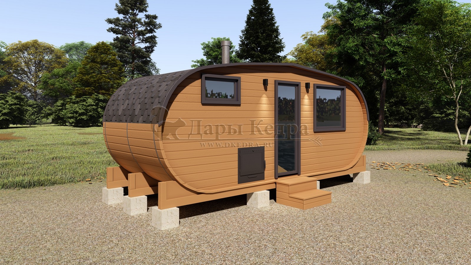 Овальная баня-бочка из кедра просторная и вместительная. Имеет два отделения: раздевалку, которую можно использовать как комнату отдыха, и парилку. Для удобства пользования раздевалка оснащена лавочкой, полкой и вешалкой из кедра. В парильном отделении располагается печь и двухуровневый открытый полок. Для установки такой модели не требуется полноценный фундамент, поэтому при необходимости ее можно перенести на другое место. Так же баню-бочку можно укомплектовать верандой со скамейками, козырьком и печью с внешней загрузкой, благодаря которой весь мусор после топки останется на улице.