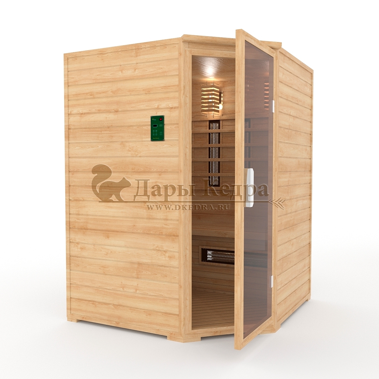 Это специально оборудованная кедровая кабина для прогрева тела человека сухим теплом. Воздух в таких парных не нагревается. Инфракрасные лучи воздействуют на тело, равномерно прогревая мышцы, суставы и органы. Керамические излучатели похожи на лампы, имеют высокую температуру нагрева, поэтому защищены противоожоговыми решетками. Тело человека в таких саунах нагревается интенсивнее. Работает кабина за счет электричества. Установка сауны в угол, позволяет рационально использовать пространство помещения. Подходит как для домашнего использования, так и для коммерции.