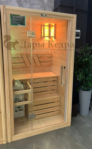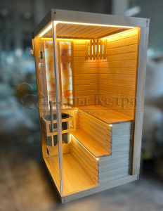 Это специально оборудованная готовая деревянная кабина для сухого и влажного парения. Электропечь нагревает пространство внутри и позволяет сбрызгивать камни водой, слегка увлажняя воздух. Такая процедура позволяет избежать перегрева. Каркас сауны выполнен из массива кедра, снаружи и внутри обшит липовой вагонкой сорта «Экстра» и имеет теплоизоляционный слой. Также двухуровневый полок идёт из кедра для обогащения внутри кабины полезными фитонцидами, а в сочетании с противовирусными свойствами липы сауна становится настоящим источником здоровья.