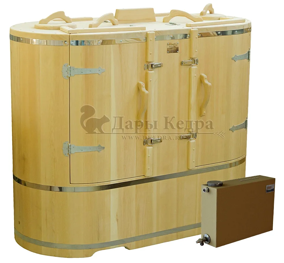 • Готовый комплект «Универсальный»: кедровая бочка с парогенератором + био-защита изнутри и снаружи Готовый комплект - это полностью укомплектованный набор с фитобочкой для процедур парения. Овальная модель более просторна и удобна в использовании. Толщина стенок составляет 40-45 мм, что позволяет увеличить срок службы изделия. Верхний скос делает положение головы более комфортным и улучшает обзор. Фитобочка оборудована откидными створками, дверцей и отверстием для головы. Во время парения человек сидит внутри кедровой бочки, а голова находится снаружи. Благодаря этому исключается возможность перегрева. Подлокотники из кедра, встроенные ручки на створках и двери делают эксплуатацию более удобной. Парение в фитобочке благотворно влияет на организм в целом: повышается иммунитет, выводятся шлаки и токсины, улучшается работа органов тела и состояние кожи.