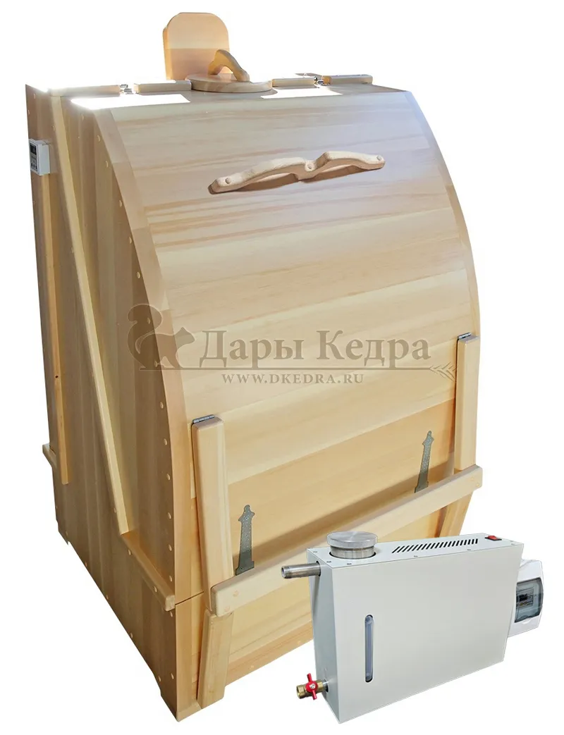 • Готовый комплект «Комфорт»: кедровая бочка с парогенератором + био-защита изнутри и снаружи Готовый комплект - это полностью укомплектованный набор с полулежачей фитобочкой для процедур парения. Такая модель наиболее комфортна, так как позволяет принимать процедуры полулежа. Толщина стенок составляет 40-45 мм, что позволяет увеличить срок службы изделия. Фитобочка оборудована откидными створками, дверцей и отверстием для головы. Во время парения человек находится внутри кедровой бочки, а голова снаружи. Благодаря этому исключается возможность перегрева Парение в фитобочке благотворно влияет на организм в целом: повышается иммунитет, выводятся шлаки и токсины, улучшается работа органов тела и состояние кожи.