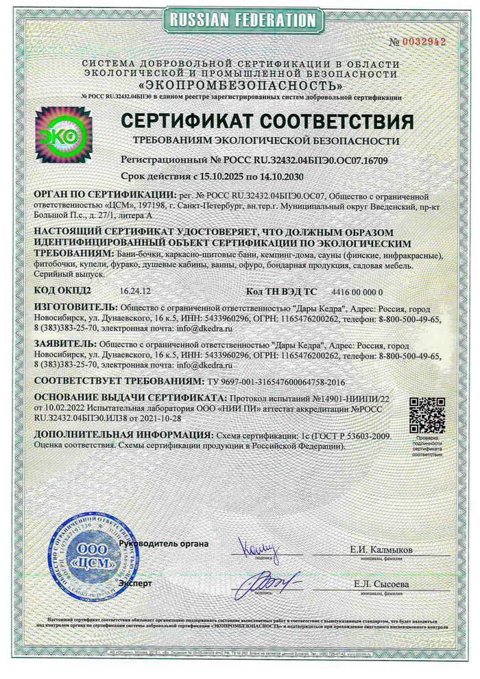 Кедр по наличию сучков делится на сорт: 0 (экстра) - не имеет сучков вообще, 1 - минимальное их количество, 2-3 сорт без ограничения по количеству сучков. Наша производственная компания хорошо изучила свойства древесины кедра, исходя из этого применяем определённый сорт для каждого типа изделий: ИК-сауны, купели, фурако делаем из кедра сорта 0-2, фитобочки - из сорта 1-2. Для фитобочек сучки необходимы, так как именно в них содержатся фитонциды. Для бань-бочек применяем 1-3 сорт, полки и лавки из 0-2 сорта. Не поддаётся гниению, так как является природным антисептиком и древесина очень пластичная, не растрескивается, любит влагу. Именно поэтому мы работаем с кедром, ценим его и рады дарить людям здоровье!