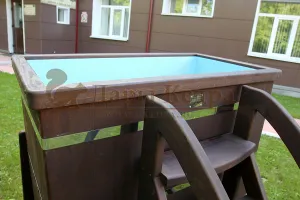 Это емкость для воды с прямоугольной пластиковой чашей. Купель предназначена для отдыха и охлаждения тела после процедур парения. Подходит для уличного и комнатного использования. Для удобства пользования овальная купель с пластиковой вставкой оснащена лавочками, приставной и внутренней лестницей из кедра.