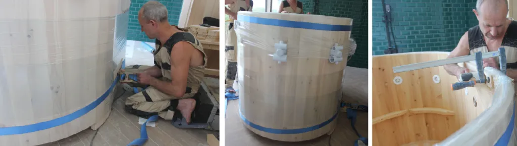 - Оставить купель до полного высыхания на 3 часа. После этого необходимо снять стяжные фиксирующие ремни и пленку. В местах склейки внутри и снаружи при необходимости убрать концелярским ножом остатки клея PUR, зашлифовать и нанести защитное покрытие, если изначально им была пропитана купель. И далее снова нанести пленку на изделие.