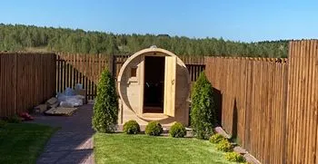 Много читал про такие бани-бочки, долго анализировал, в итоге пришел к мнению, что трехметровая баня-бочка-это оптимальное соотношение цены и качества, пространства. Кстати, в ней вполне хватает места даже для одновременного нахождения 3-4 человек, комфортнее, конечно, вдвоем)). Смотрится на участке красиво! Несколько раз протестировали баньку, остались очень довольными, а впереди целое лето...будем париться почти каждый день))